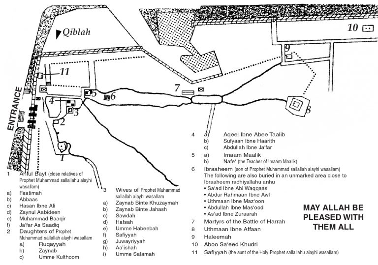 Jannatul Baqee – This is the graveyard of Madeenah Munawwarah where lie many great Companions of the Prophet sallallahu alayhi wasallam. Imaam Maalik puts their number at ten thousand from whom the most prominent is Hadhrat Uthmaan radhiyallahu anhu.