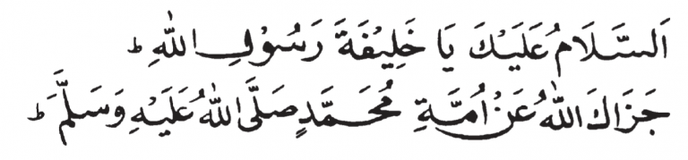 assalaamu alayka yaa khaleefata rasoolillaah. jazaakallaahu an ummati muhammad sallallahu alayhi wasallam Peace be upon you O Caliph of Rasoolullah. May Allah reward you well on behalf of the ummah of Muhammad sallallahu alayhi wasallam.